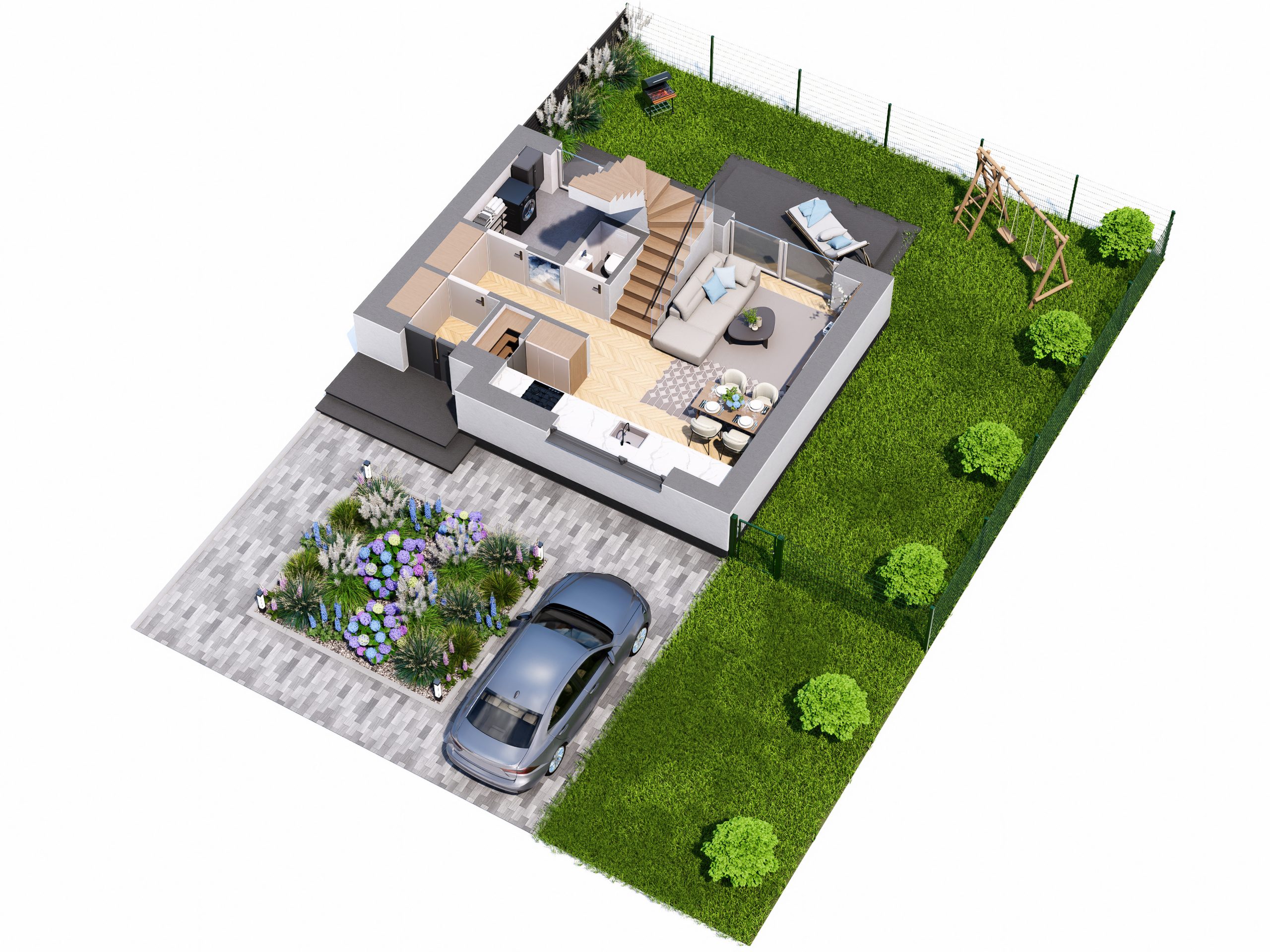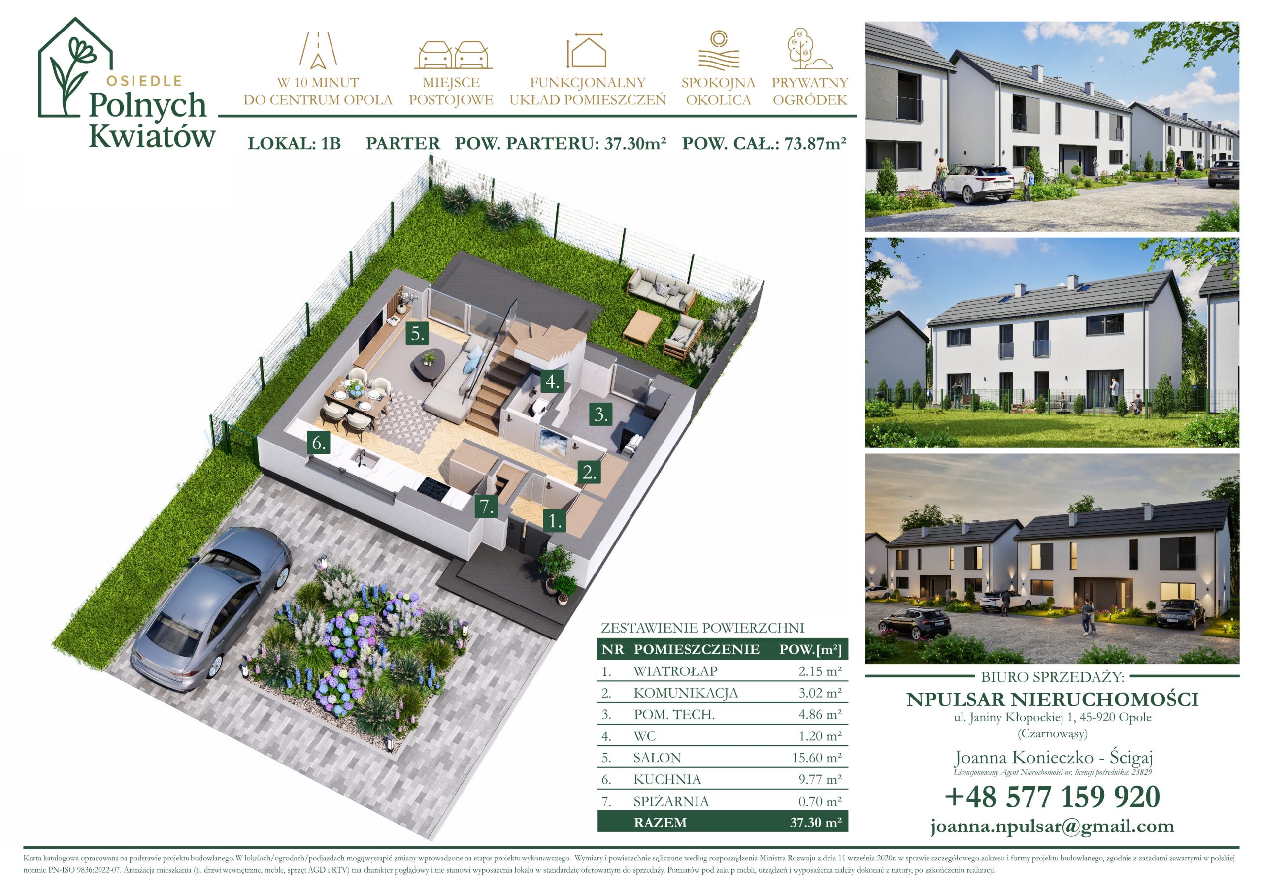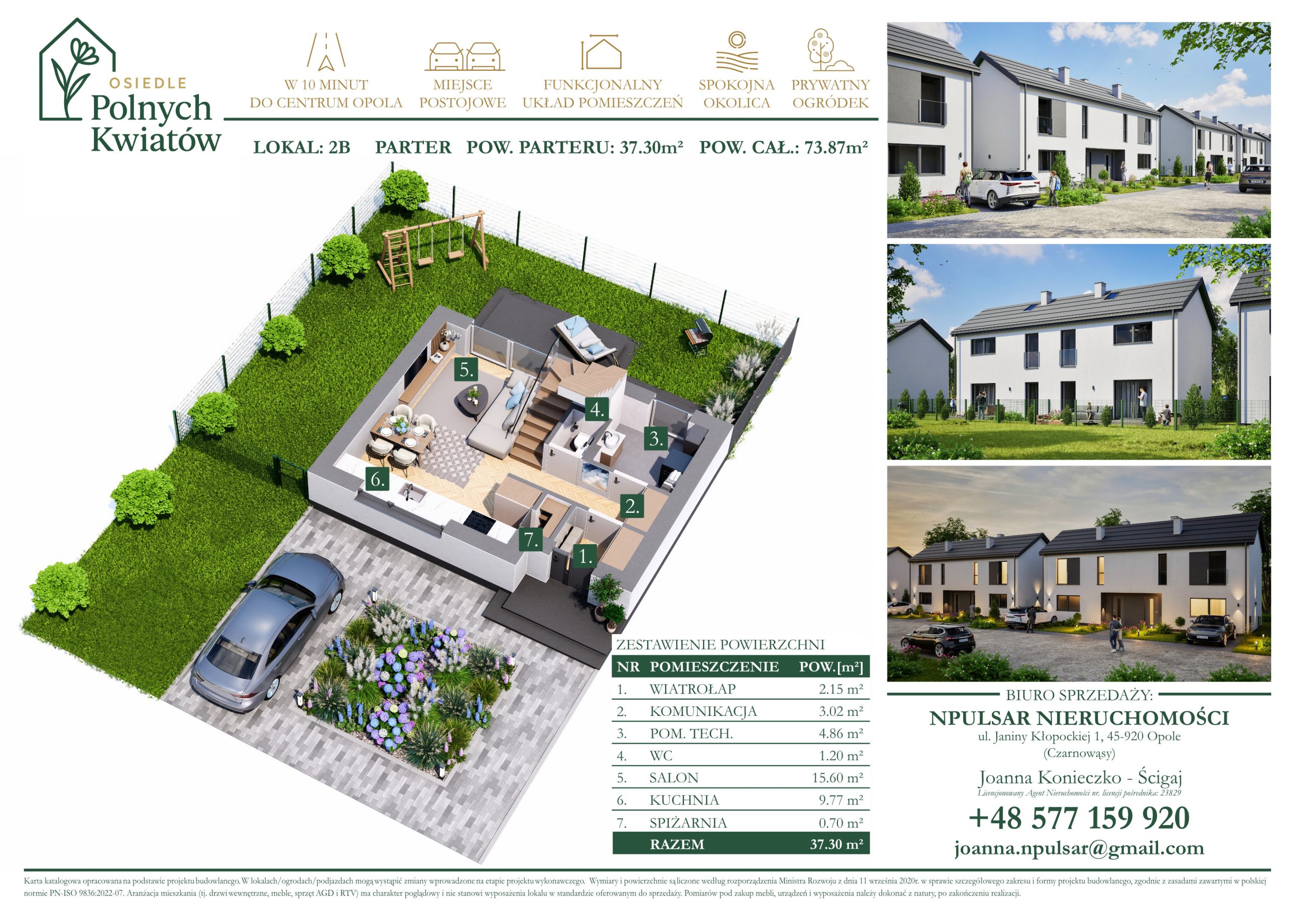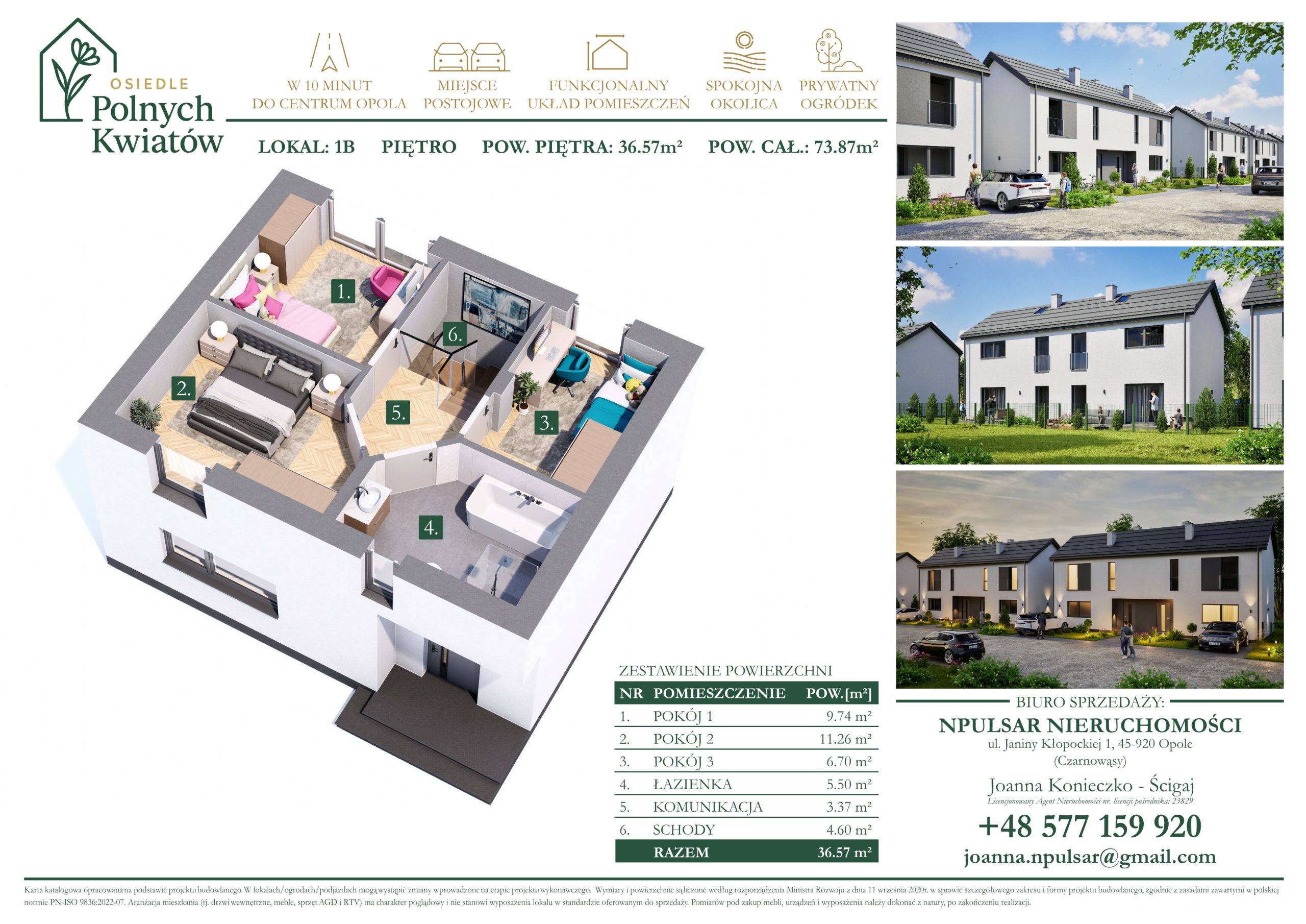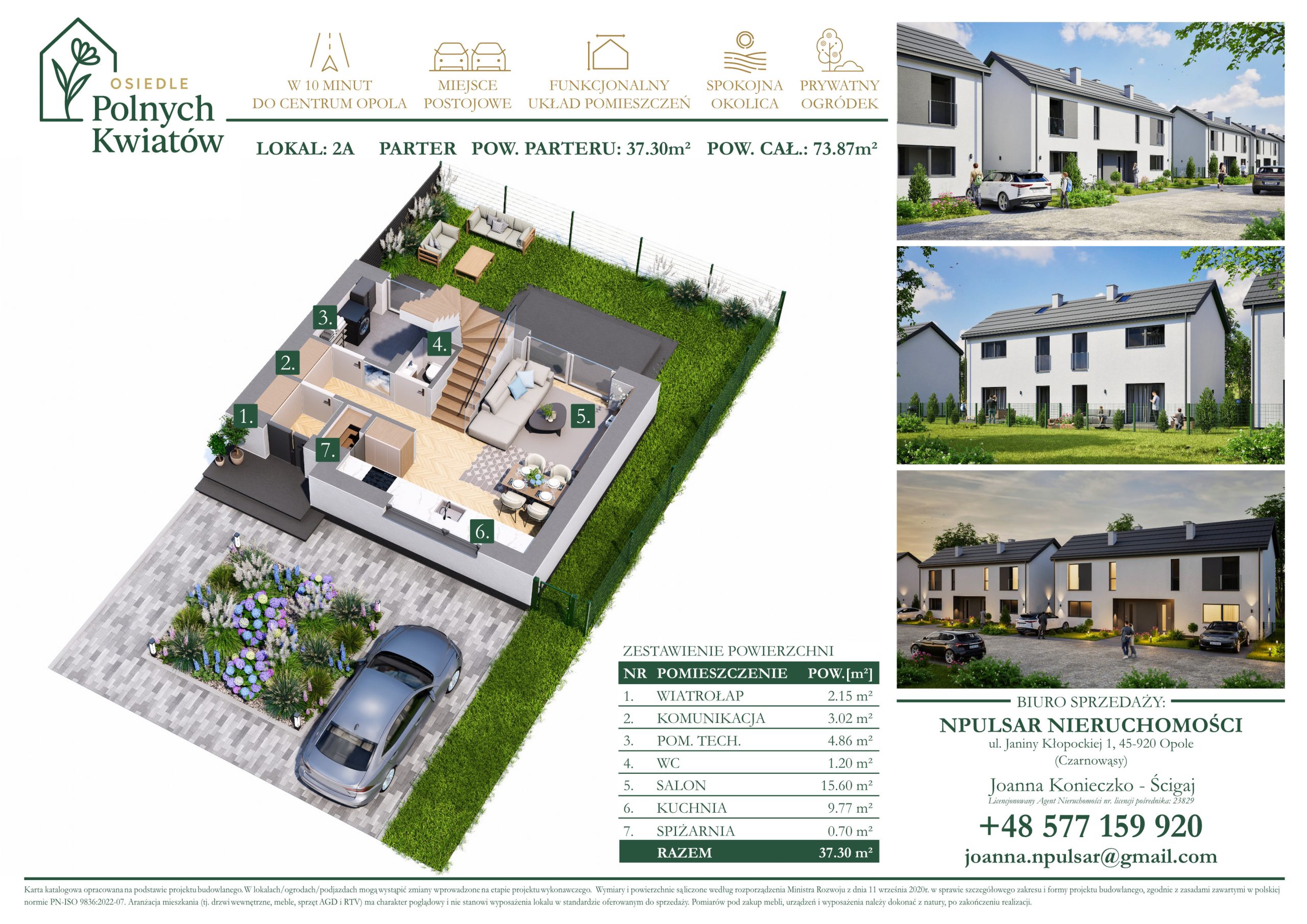 „Osiedle Polnych Kwiatów” to kameralny projekt obejmujący budowę 8 budynków w zabudowie bliźniaczej, czyli łącznie 16 segmentów mieszkalnych zaprojektowanych z myślą o komforcie codziennego życia. Każdy dom ma powierzchnię użytkową 73,87 m², rozplanowaną funkcjonalnie – dla rodzin i osób szukających wygodnego domu blisko miasta.